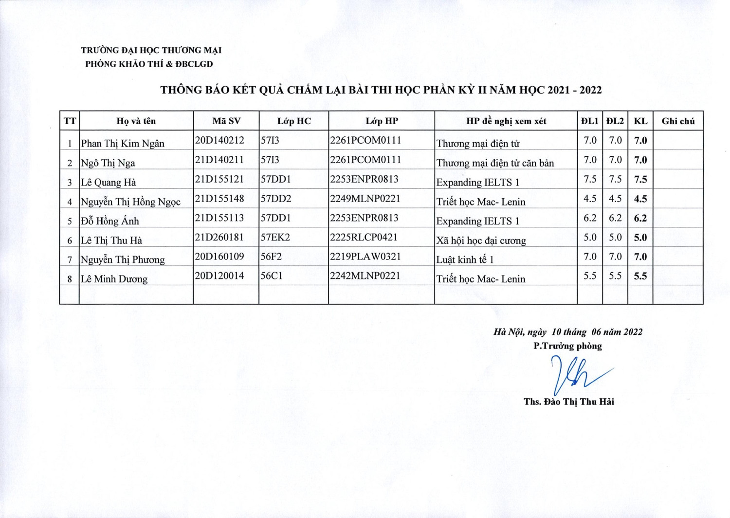 Thông báo kết quả chấm lại bài thi học phần kỳ II năm 2021 -2022 ( Lần 5)